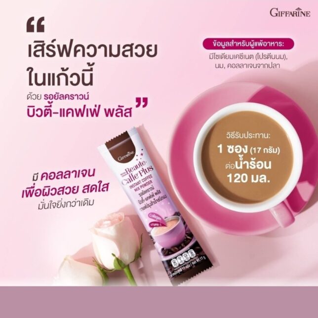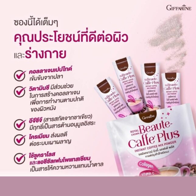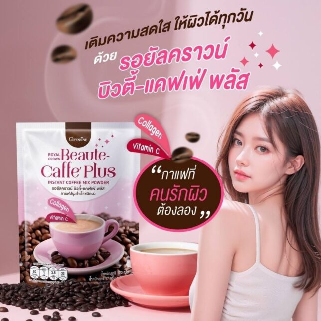 หลายคนอาจจะสงสัยว่ากาแฟจะช่วยเรื่องผิวได้อย่างไร คำตอบอยู่ที่ส่วนผสมสุดพิเศษที่กิฟฟารีนคัดสรรมาใส่ไว้ในกาแฟซองนี้ครับ รอยัลคราวน์ บิวตี้-แคฟเฟ่ พลัส เป็นกาแฟ 3 in 1 ที่มีส่วนผสมของคอลลาเจนและวิตามินซี ที่ช่วยเสริมประสิทธิภาพในการดูแลผิว ทำให้ทุกการดื่มกาแฟของคุณเป็นการเติมอาหารดีๆ ให้กับผิวนั่นเอง