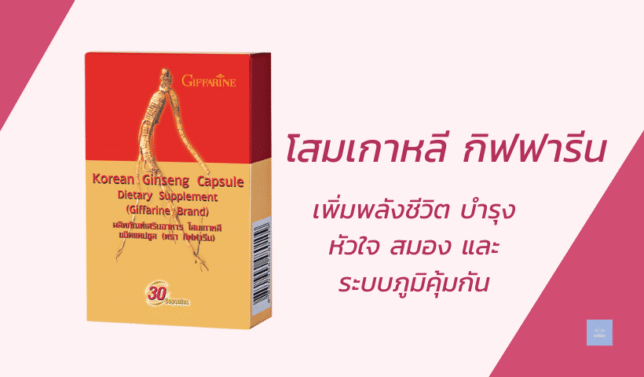 โสมเกาหลีถือเป็นสมุนไพรอันดับหนึ่งของโลกตะวันออกที่มีการใช้มายาวนานหลายร้อยปี ด้วยคุณสมบัติเพิ่มพลังชีวิต บำรุงหัวใจ สมอง และระบบภูมิคุ้มกัน วันนี้ กิฟฟารีน ได้สกัดคุณค่าของโสมแท้ 100% ออกมาในรูปแบบ แคปซูล ที่รับประทานง่าย พกพาสะดวก เหมาะสำหรับคนที่มีไลฟ์สไตล์เร่งรีบ